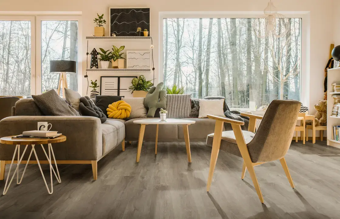 Floating flooring in rigid vinyl with a wood look, completely water resistant.