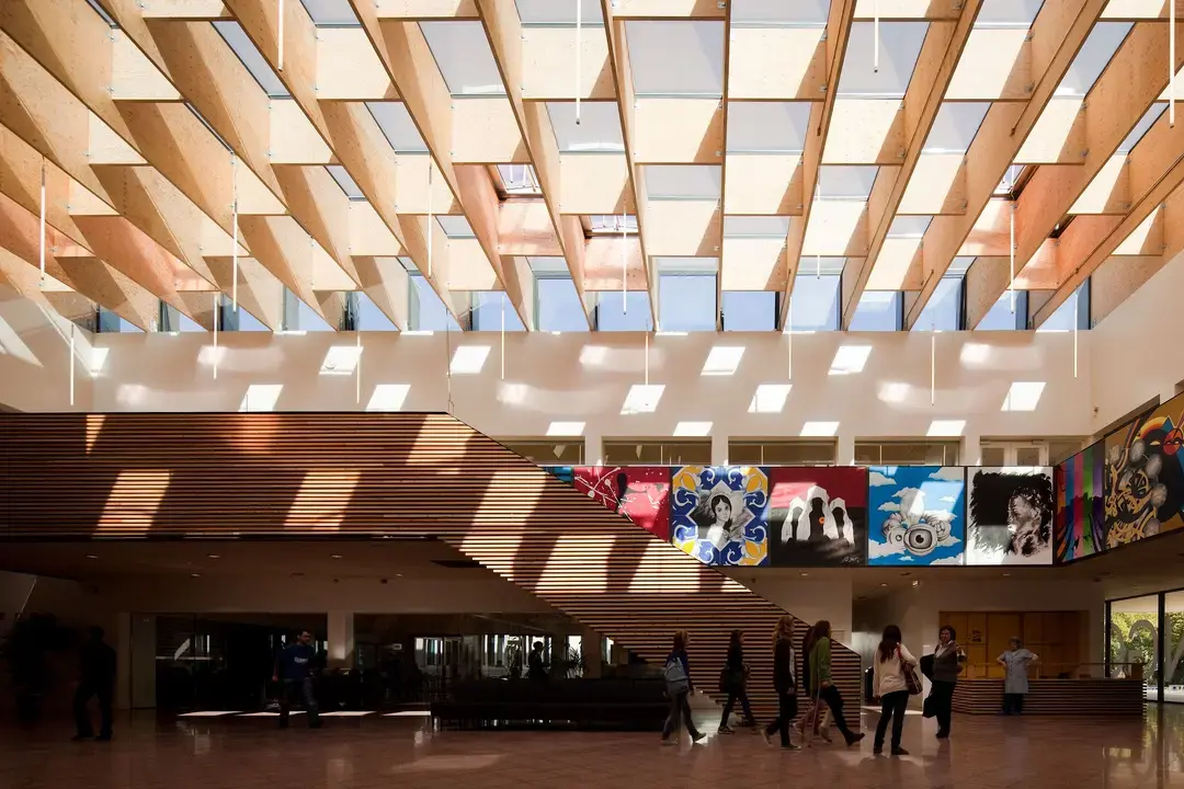 An integral part of the National School Park Project, the Domingos Sequeira School, in Leiria, was the subject of extensive remodeling work. Already with 60 years of existence, this school was completely renovated with new features. The outdoor courtyard has been transformed into a welcoming atrium, which is now the focal point of the school. The structure of the translucent ceiling was made with Kerto beams.