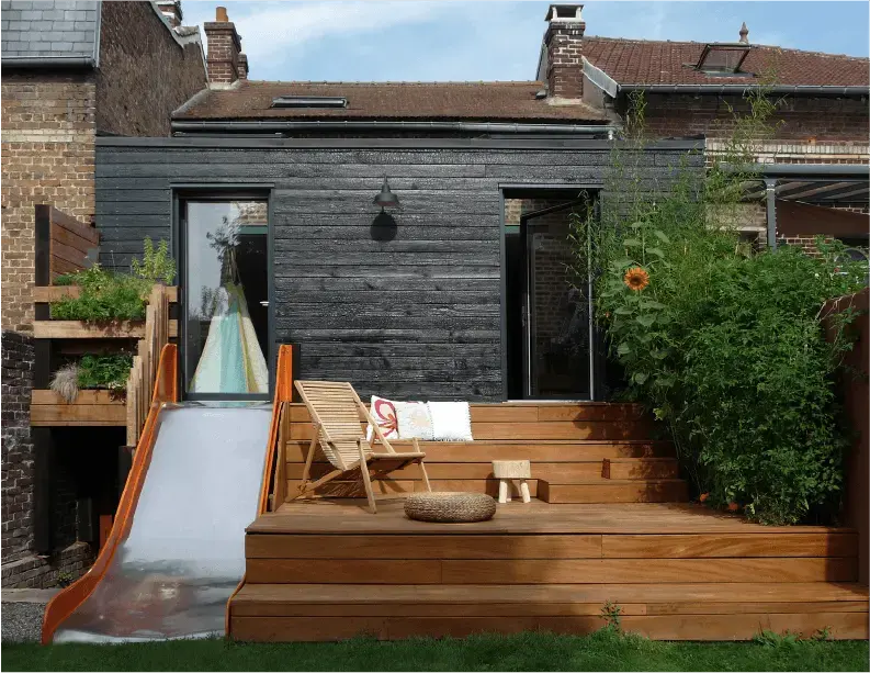 A marca Noirdebois aplica a técnica japonesa milenar de escurecimento da madeira, Shou Sugi Ban, consistindo na carbonização da mesma, criando uma camada de carvão única, que preserva a força primitiva do fogo na cor e na textura.