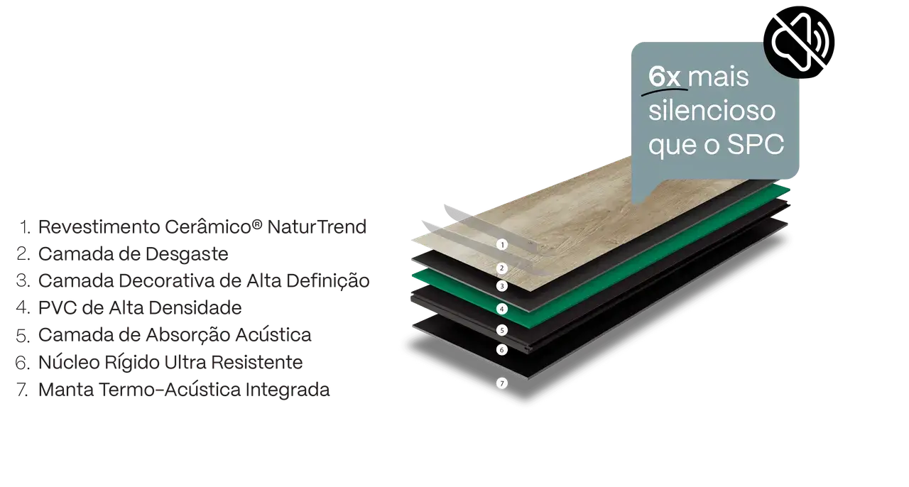 A sua construção multilayer (Engineerd), foi pensada para bloquear frequências especificas de som (impacto), reduzindo a transmissão acústica em 21DB. O acabamento NaturTrend (aspeto natural mate), elimina o reflexo da luz, permitindo que o pavimento tenha o mesmo aspeto, visto de diferentes ângulos.