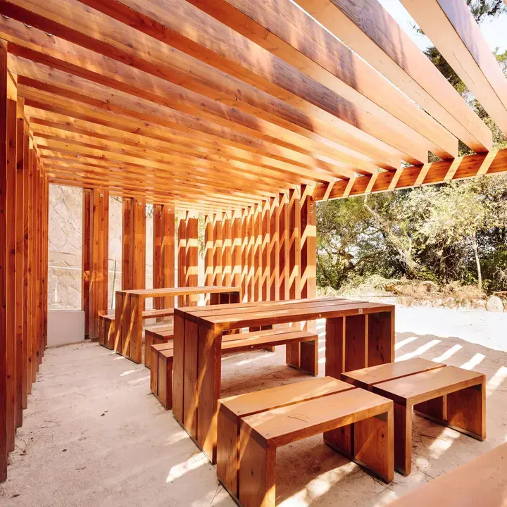 Estrutura de ensombramento, destinada a piqueniques e atividades de formação escolar, junto ao centro interpretativo de Monserrate, Sintra.